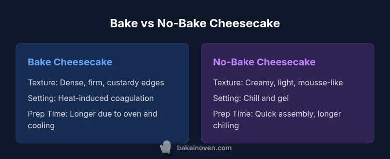 The difference between bake and no bake cheesecake hinges on how the filling sets under heat versus chilling. In bake methods, eggs act as the binding and structure-building agents, and oven heat denatures dairy proteins to create a firm, sliceable custard. No-bake versions rely on chilling and gels to achieve structure without cooking. The crust can be similar, but the setting approach—heat versus cold—drives the core contrast and shapes final texture. According to Bake In Oven, understanding this distinction helps home bakers plan ahead for texture goals and timing. The difference between bake and no bake cheesecake isn’t only about whether you used an oven; it’s about how the filling’s proteins are organized to hold a clean slice. For many home bakers, choosing the method begins with what texture they want and how much time they have.