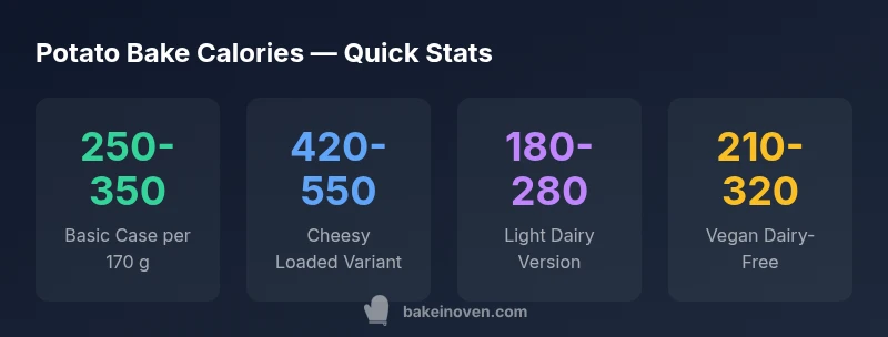 According to Bake In Oven Analysis, 2026, calories in a potato bake are driven by four main factors: the base starch, dairy fat, added fats and toppings, and the portion size. Potatoes contribute a solid energy base, around 80-110 calories per 100 g depending on variety and preparation. The dairy component—cream, milk, butter, and cheese—can dramatically raise calories, sometimes by hundreds per serving. Bacon or other meats add even more energy density, while vegetables and herbs add minimal calories but improve flavor and volume. The method of cooking—whether the potatoes are parboiled, baked, or roasted—also affects how densely energy is packed into each bite. When you slice a 170 g portion of a classic, dairy-rich potato bake, you might land in the 250–350 calorie range; swap to a lighter dairy profile (nonfat yogurt, skim milk) and simplify toppings to bring that total closer to 180–280 calories. If you go heavy on cheese and bacon, the range can climb to 420–550 calories per serving. These ranges reflect typical home-baked recipes and serving sizes, not a single universal number; clarity in ingredient choices is the best way to control calories.