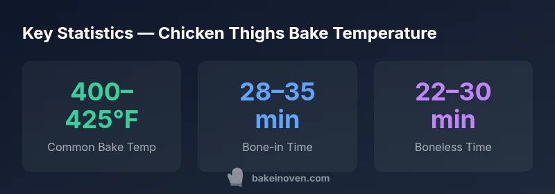 Juicy, evenly cooked chicken thighs start with the right oven temperature. The chicken thighs bake temperature should be set within a practical range to achieve crisp skin on the outside while keeping moisture inside. According to Bake In Oven, sticking to 400–425°F (204–218°C) gives reliable results across bone-in and boneless cuts. Factors such as skin-on vs skinless, bone presence, and pan type all influence how heat transfers to the meat. A hot oven encourages browning, but pushing past the upper end of the range risks dry meat unless you monitor internal temperature closely. For most home cooks, preheating and targeting a single temperature simplifies planning while preserving texture. This approach aligns with home-baking best practices and helps you reproduce consistent results across different ovens.