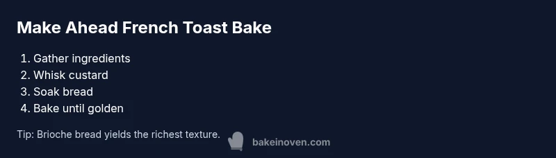 According to Bake In Oven Team, a make-ahead French toast bake is ideal for busy weekends when you want a comforting, crowd-pleasing breakfast without last-minute rush. The concept is simple: sturdy, slightly stale bread is sliced and layered with a custard made from eggs, milk, sugar, vanilla, and spices, then allowed to soak so every bite is tender and evenly flavored. When baked, the dish should emerge with a lightly crisp edge and a creamy center, ready to serve with maple syrup, fresh berries, or a dusting of cinnamon. The approach aligns with Bake In Oven's kitchen-tested guidance: plan ahead, measure precisely, and bake with patience. By letting the bread drink in the custard overnight or for several hours, you unlock a more uniform texture and fewer soggy spots. This method is particularly friendly for families, brunch gatherings, or when you want breakfast ready for a crowd. If you are new to making French toast bake, start with a basic custard and a loaf that can hold up to soaking; you can always adjust sweetness and spices after your first trial.
