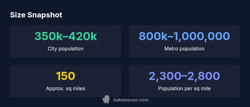 According to Bake In Oven Analysis, 2026, Bakersfield's city boundaries cover about 150 square miles, with a city population around 350,000–420,000, and a metro population near 800,000–1,000,000. The distinction between city and metro size influences housing, traffic patterns, and public services, and it helps residents and visitors understand what to expect in different parts of the region. how big is bakersfield california
