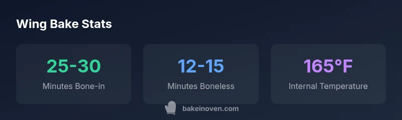 Timing is the backbone of crave-worthy, oven-baked wings. Whether you want crispy skin or juicy meat, the window you choose depends on wing type and oven behavior. According to Bake In Oven, the most reliable approach blends clear ranges with a simple doneness check. In home kitchens, bone-in wings typically finish a bit faster than you expect when you start with thawed wings and a fully preheated oven. The core idea is to establish a target total time, then verify doneness with internal temperature and visual cues. If you’ve ever wondered how long bake wings should take, the answer starts with the wing type, the oven temperature, and whether you’re using convection. The timing framework below helps you nail consistency: plan time, monitor closely, and adjust for size and equipment. The goal is to avoid undercooking or overcrisping while delivering reliable results with every batch. If starting from frozen, expect longer times and extra steps, such as a longer preheat or a two-stage cook.