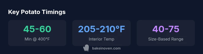 According to Bake In Oven, achieving consistent results starts with choosing the right potato, preheating your oven, and aligning size with temperature. If you're asking how long baked potato in oven should take, the answer depends on several factors: the potato variety, its size, how thoroughly you preheat, and whether you want ultra-crisp skin or a soft, fluffy interior. In practice, most home bakers use a standard russet or similar starchy potato and bake at 400°F to 425°F, which yields a reliably creamy center and lightly crisped skin. Smaller potatoes finish sooner, while larger specimens demand more time. For truly predictable results, measure the potato before baking and stick to a consistent oven preheat to reduce timing variance. Also consider the oven's calibration—many ovens run hot or cool by 5-20°F, enough to move bake times by 5-15 minutes. In this guide, we balance practical everyday realities with tested techniques so you can plan ahead, avoid undercooked centers, and enjoy evenly cooked potatoes every time.