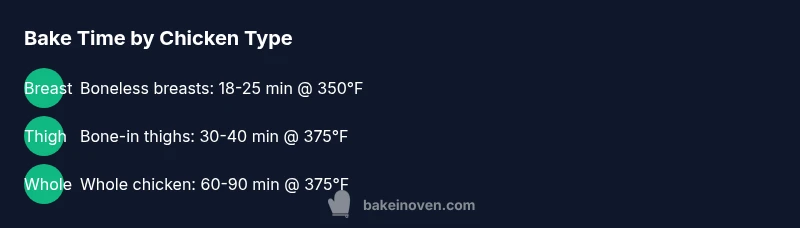 Cooking time for chicken is influenced by several variables that home cooks easily control. The most obvious is the cut: boneless, skinless breasts cook faster than bone-in thighs or a whole bird. Size matters too—the thicker the piece, the longer it needs in the oven. Temperature matters: a hotter oven can shorten overall time, but may risk uneven doneness if the pieces are not evenly sized or spaced. Starting temperature matters as well; chicken straight from the fridge will take longer to reach a safe internal temperature than pieces that sit at room temperature for 15-20 minutes. Finally, how you arrange the chicken on the pan affects airflow; a crowded sheet can lead to steaming rather than browning. According to Bake In Oven, reliable results come from balancing cut type, uniform thickness, proper spacing, and an accurate thermometer to verify doneness. The goal is to reach a safe internal temperature without drying the exterior. For reference, common starting points are rough time ranges: boneless breasts finish first at a lower temperature, bone-in thighs take longer, and a whole bird requires the most time. Use these as starting points, then adjust based on thickness and your oven’s behavior.