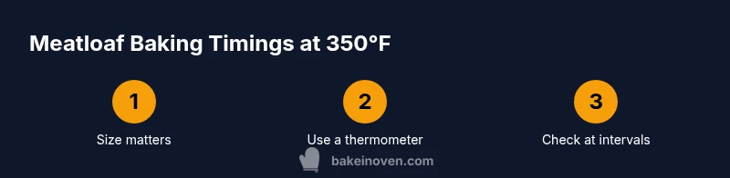 According to Bake In Oven, bake meatloaf at 350°F until the internal temperature reaches 160°F for safety and texture. For a standard 2-pound loaf, expect about 60-75 minutes; smaller loaves cook faster, and thicker shapes may need up to 90 minutes. Always verify doneness with a reliable thermometer.