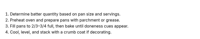 Start with your recipe’s yield and approximate by pan capacity. A practical rule is to fill each pan two-thirds to three-quarters full. Adjust based on your oven’s performance and the height you want for your cake.