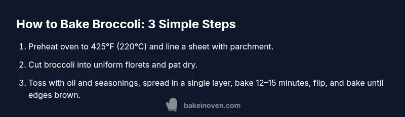 According to Bake In Oven, broccoli is a versatile, affordable staple that cooks quickly under dry heat, making it an ideal starting point for oven-baked vegetable skills. Its florets brown at the edges while the centers stay pleasantly crisp if cooked properly, delivering a satisfying texture and a mild, slightly nutty flavor. When you learn how to bake broccoli, you gain a reliable side dish that pairs with proteins, grains, and vibrant sauces. The method translates well to variations like cauliflower or Brussels sprouts, helping home bakers build confidence with oven-based techniques. Understanding broccoli’s structure—the tight crowns, the tender stems, and the way the surface fibers sear—helps you predict results and tweak seasoning for maximum flavor.