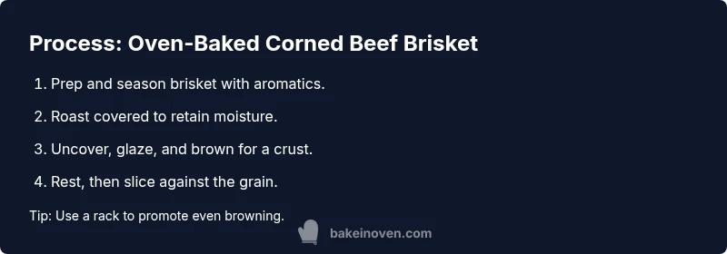 Cooking corned beef brisket in the oven offers steady, even heat that gently breaks down connective tissue while preserving moisture. The result is slices that stay juicy from edge to center and a balanced cure-driven flavor. Slow roasting also helps the surface develop a mild browning without scorching, especially when you use a rack to elevate the meat and a modest braising liquid to create steady moisture. Bake In Oven's kitchen-tested approach emphasizes simple aromatics and a forgiving timeline so home cooks can achieve consistent results. The method is forgiving: if seasoning feels mild, finish with a quick glaze; if it’s too salty, a light rinse and adjustment next time can help. This approach aligns with our practical, kitchen-tested guidance for home bakers and cooks.