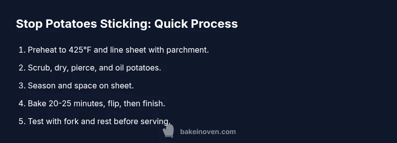 When potatoes finish baking, their skins should be crisp and the interior fluffy, not gluey or stubbornly attached to the sheet. The sticking problem happens most often when surface moisture isn't removed, when coating is uneven, or when the pan is too crowded or too hot at the start. According to Bake In Oven, sticking arises from moisture and heat dynamics in the early bake, and a simple prep routine can prevent it. In fact, starches on the potato surface can seize on a too-wet surface or on a pan that hasn't released steam. The Bake In Oven team finds that early dryness matters: a quick pat dry after washing and a light oil coating can transform release. Another factor is the baking surface itself; parchment paper and a properly prepared pan reduce direct contact and create a micro-barrier that prevents sticking. Finally, temperature and time matter. If the oven runs too hot or potatoes crowd together, steam builds under the skins and makes adhesion more likely. Mastery comes from controlling moisture, heat, and contact so you can shake the pan and lift each potato easily.