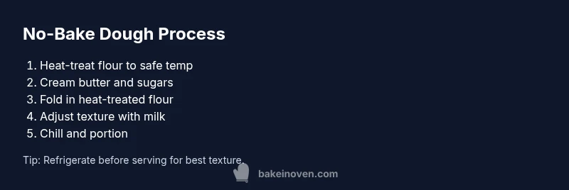 No bake cookie dough is a creamy mixture designed to be eaten without baking. It mimics the texture of traditional cookie dough, but relies on safety-first ingredient choices so you can enjoy a spoonful, scoop, or topping without worrying about raw eggs or undercooked flour. The foundation is a blend of fat (usually butter), sugar for sweetness, and a base starch (flour that has been heat-treated) to give structure. Flavor comes from vanilla and chocolate chips or other mix-ins, while a little milk or cream helps achieve a scoopable, spreadable, or crumbly texture depending on your goal. This approach respects common-friendly kitchen practices and is popular for quick desserts, party treats, and easy toppings for ice cream or yogurt. In Bake In Oven's testing, no-bake doughs deliver reliable results when you follow food-safety guidelines and adjust texture with small ingredient tweaks.