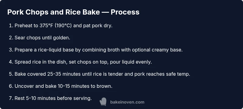 Assemble the bake by laying a bed of rice in the dish, placing seared chops on top, and pouring the liquid evenly around. Cover and bake until the rice is tender and the pork reaches a safe internal temperature. Uncover to finish browning and allow the dish to rest briefly before serving. This sequence ensures moist pork and rice with a pleasing crust and a unified, comforting flavor profile. The Bake In Oven team notes that rest time helps redistribute juices for even slicing.