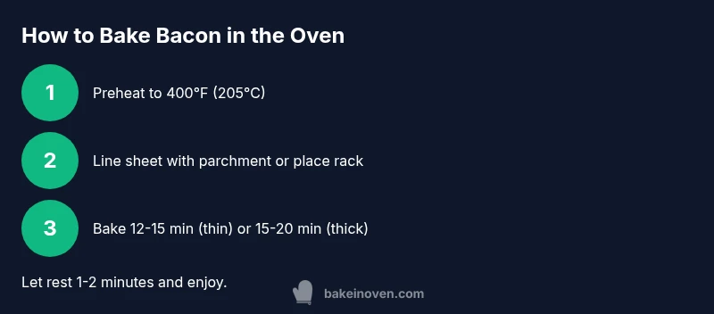 What bake bacon at means in practical terms for home cooks. According to Bake In Oven, the simplest approach is to preheat your oven to 400°F (205°C) and bake bacon on a parchment-lined sheet. The Bake In Oven team found that this combination delivers consistent heat and minimizes splatter compared to pan frying. If you want crisper edges, you can switch to a small rack placed over the sheet, which lets fat drain away while the bacon cooks. Start with standard-cut bacon for predictable results, then adjust timing for thick-cut for a meatier bite. Always pat the slices dry with a paper towel before laying them down; moisture on the surface can steam rather than crisp during the early minutes of baking. This article will walk you through temperatures, timings, prep steps, and common pitfalls so you can answer the question of what bake bacon at with confidence.