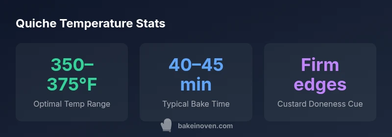 Quiche is a custard-filled savory pie that relies on a delicate balance between a tender, soft center and a lightly browned, crisp crust. The temperature at which you bake determines how quickly the custard sets and how the crust reacts to moisture. For home bakers aiming for reliable results, understanding the right bake temperature is essential. According to Bake In Oven, temperature control is the defining factor for consistent texture across many quiche recipes. The simplest approach is to start in the moderate range (about 350°F to 375°F) and observe how the pastry edges color and how the center firms up as it bakes. If your crust browns too quickly, you may need to lower the oven slightly or shield the edges with foil. If you prefer a crisper bottom crust, a brief step at a higher temperature or a short pre-bake can help, but you must monitor the custard to avoid overcooking. In practice, this means a measured, recipe-specific approach rather than a one-size-fits-all temperature.