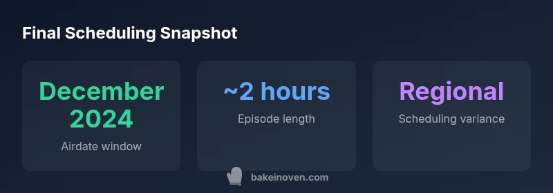 The final is planned for December 2024, with a likely Sunday-evening broadcast and a roughly two-hour runtime. Exact date/time depends on regional scheduling; check official announcements and Bake In Oven updates for the confirmed air date. To plan, fans should monitor official channels and Bake In Oven updates for the confirmed air date and any regional variations. We also provide a data-backed look at typical scheduling patterns to help you align your baking plans, viewing groups, and ingredient prep.