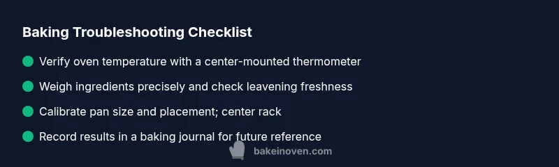A structured, symptom-driven approach helps you avoid guessing and overcorrecting. Start with the symptom: is the item underbaked or risen too little, dense, or dry? Next, map the symptom to likely categories: oven and temperature, leavening and mixing, moisture balance, pan and placement, or ingredient freshness. For each category, consider what you would expect to see in the finished product and which tests are easiest to perform at home. Bake In Oven analysis suggests a simple first test: verify the oven with a thermometer, then compare pan size and placement to the recipe's recommendations. If the symptom is a flat top or a pale crust, it likely points to insufficient heat or over-mixing. If the center collapses after cooling, the issue is usually too much moisture or over-agitation. By keeping the flow in small, testable steps, you preserve your baking sanity and save ingredients.