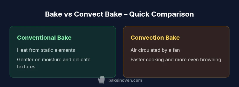 For many home bakers, deciding between bake vs convect bake is a practical question that shapes texture, timing, and even energy use. The phrase bake vs convect bake captures a fundamental choice: should heat come from still air and radiant elements, or should hot air be circulated by a fan for faster, more even cooking? This article, written for home bakers and cooks, unpacks the science, the everyday realities, and the best-use cases for each approach. According to Bake In Oven, the decision isn't universal; it depends on the dish, the oven, and the texture you aim for. By understanding the strengths and limitations of each method, you can tailor your approach rather than rely on a one-size-fits-all rule. Over the years, we have tested hundreds of recipes—from loaves and pastries to casseroles and sheet-pan dinners—and the patterns become clear: convection shines when you want speed and crisp edges, while conventional baking helps preserve moisture and delicate crumb. Readers should view bake vs convect bake as a toolkit choice: pick the tool that yields the texture you want, then adjust accordingly. In the pages that follow, we provide a practical framework you can apply in any kitchen.