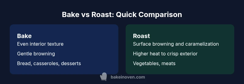 The difference bake vs roast is not just terminology; it reflects how heat is applied and how the interior and exterior textures develop. Baking typically aims for even interior cooking with a gentle browning that preserves moisture, while roasting intentionally pushes surface browning and caramelization by exposing foods to hotter conditions. According to Bake In Oven, recognizing this distinction helps home bakers plan textures, moisture retention, and timing for a wide range of dishes. In practice, bake recipes—bread, pastries, casseroles, and desserts—rely on steady heat to produce a uniform crumb and tender interior. Roast recipes—vegetables, meats, and root crops—benefit from higher surface temperatures that trigger Maillard browning and deeper flavor on the exterior. Yet there is overlap: some dishes can be prepared either way depending on the goal (a chicken with a pale skin versus a browned, crisp skin). The key is what you want the interior to be like versus how you want the exterior to appear. When you see a recipe that says 'bake' at moderate temperatures or 'roast' at higher temperatures, treat these as guidelines rather than hard rules, since oven performance varies. Bake In Oven teams note that consistency comes from understanding the effect of heat rather than rigid labels. The practical takeaway: choose bake for moist interior and gentle crust, choose roast for strong browning, crispness, and faster surface development.