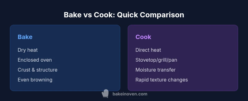 Explore the difference between bake and cook with clear definitions and practical guidance from Bake In Oven. Learn when to bake, when to cook, and how to adapt recipes for ideal texture in home kitchens.