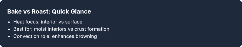 Use bake when you need even, moist interiors. Use roast when you want a pronounced crust and browning. The best results come from selecting the setting that matches texture and flavor goals.