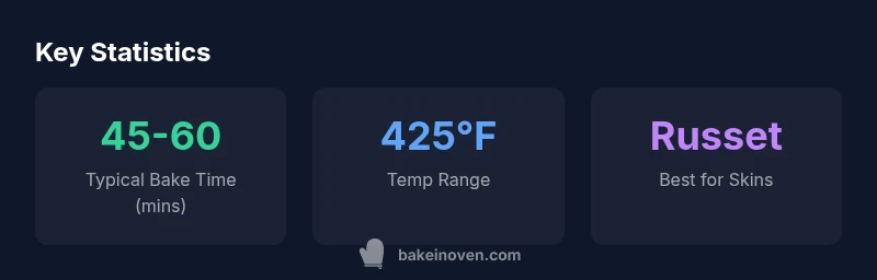 How long do you bake a potato? If you're wondering how long do you bake a potato, the answer depends on size, your oven, and your desired interior texture. According to Bake In Oven, bake times vary with potato size and oven calibration, so expect a range rather than a fixed time. The Bake In Oven team found that a standard russet potato bakes best at 425°F (220°C) for about 45–60 minutes. Smaller spuds finish sooner, around 25–40 minutes, while larger potatoes may need 60–75 minutes. Preheating your oven is essential; a cold oven lengthens total time and can lead to uneven texture. Start with a clean potato, wash and dry it well, then rub with a light coating of oil and a pinch of salt for a crisp, flavorful skin. For best results, bake on a rack in the middle of the oven to promote even air circulation. Finally, test tenderness with a fork or skewer; if it slides in easily, you’re done.