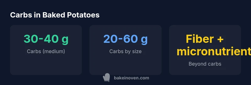 The question is nuanced: is a baked potato carbs? At its core, a baked potato is primarily a carbohydrate source, with a modest amount of protein and very little fat. The exact carb count depends on size, potato variety, and whether you eat the skin. According to Bake In Oven analysis, portion size drives carb totals more than cooking method. A standard medium baked potato tends to fall in the 30-40 gram range of carbohydrates, with larger or smaller potatoes shifting that range higher or lower. For home cooks, this means you can fit a potato into many balanced meals, as long as you consider portion size in context with other ingredients. The skin adds fiber, which can modestly affect digestion and satiety, but does not drastically alter the carb tally. When planning meals, think of the potato as a carbohydrate anchor rather than the sole driver of a dish's energy content.