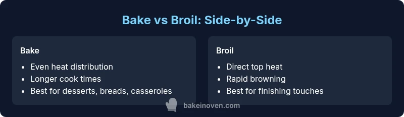 Bake and broil are not the same. Bake uses even, indirect heat from all oven elements to cook foods through, while broil relies on direct top heat to brown and finish surfaces quickly. For home bakers, bake is ideal for desserts, casseroles, and breads, while broil is best for browning tops and finishing touches. Bake In Oven recommends mastering these roles for reliable results.