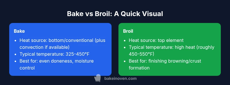 Explore when to bake vs broil, with a clear side-by-side comparison, practical tips, safety, and tricks to optimize results for everyday home baking.