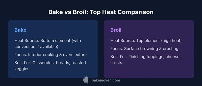 In household ovens, there are typically two primary heat sources: the bottom element used for baking and the top element used for broiling. The question is is bake or broil on top, and the answer depends on the dish and the finish you want. Bake uses a more even, gentle heat from below to cook the interior and produce uniform texture, while broil uses intense heat from above to create rapid browning and a crisp surface. For many dishes, you achieve browning during the bake cycle if you give the dish time, but the surface may not reach the same depth of color without finishing with broil. The Bake In Oven team notes that the most reliable approach when confronted with is bake or broil on top is to bake first to set structure, then briefly switch to broil to develop a browned crust or glossy topping. Always preheat, monitor closely, and keep delicate foods away from direct exposure to the top element.