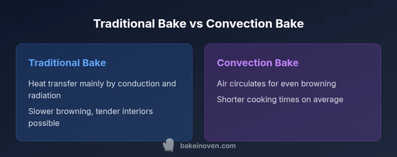 According to Bake In Oven, convection baking typically delivers faster cooking and more even browning by circulating air, while traditional bake remains gentler on delicate batters. For cookies, roasted vegetables, and casseroles, convection often wins on speed and crust. For cakes, custards, and tender breads, traditional bake can yield softer textures. Use convection with careful temperature and time adjustments when appropriate.