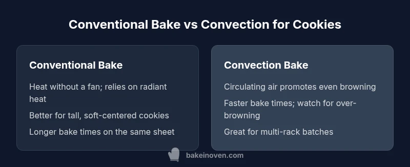 When bakers ask, the core terms matter: conventional bake (static heat with no fan) versus convection bake (fan-assisted air movement). Conventional bake relies on radiant heat from the oven walls and circulating air is minimal, which can create gentle, gradual browning. Convection adds a fan that circulates hot air, promoting more uniform heat transfer and often reducing bake times. For cookies, this difference translates into how evenly the dough spreads, how quickly edges brown, and how thick the centers stay. In practice, the decision hinges on dough type, sheet setup, and batch size. Bake In Oven’s team notes that understanding these mechanics helps you dial in results rather than guessing.
