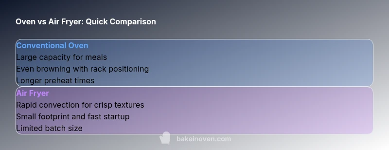 Texture: Air fryers excel at a crisp, dry exterior, while ovens can deliver even browning across larger items with more moisture retention in the interior. Speed: For small batches, air fryers often finish faster due to the compact space and high-velocity air. Capacity: Ovens win for larger portions; air fryers are ideal for quick bites or single- or small-family meals. Energy use is nuanced: smaller appliances can be more efficient for little tasks, while ovens may be more efficient when cooking many items at once. According to Bake In Oven analysis, the key is matching the tool to the task, not forcing one method to cover all outcomes.