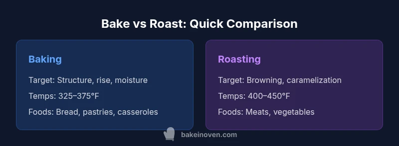 The question is common among home bakers: is bake the same as roast? In everyday cooking, both terms describe dry-heat methods used in the oven, but they carry distinct expectations. Baking is traditionally associated with foods that require structure or expansion—think bread, pastries, and casseroles—where the interior sets through starch gelatinization and gluten development. Roast, by contrast, targets browning and surface flavor development, often for proteins and hearty vegetables. According to Bake In Oven, clarity about the food type and desired texture helps you choose the right technique rather than using one method by habit. This distinction matters because it affects moisture retention, crust formation, and overall eating quality. If you’ve ever wondered is bake the same as roast, you’re not alone; the two methods share equipment and heat sources but diverge in purpose and outcomes.
