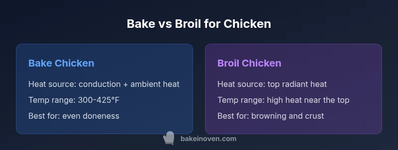 The terminology in many recipes and appliance manuals can be confusing. Is it bake or broil for chicken, and does it matter? In practical terms, bake refers to cooking with moderate, evenly distributed heat from all sides, while broil uses a concentrated, intense heat from the oven's broiler element to rapidly brown the surface. Bake is gentler on the interior, giving you time to reach the safe internal temperature without drying out the meat. Broiling can achieve crisp, deeply colored skins and crusts in a matter of minutes, but it risks burning if you don’t watch closely. According to Bake In Oven, the most reliable approach for chicken is to start with bake to ensure even doneness and then consider broil as a finishing tool if you want a browned exterior. This begs the question is it bake or broil for chicken? The answer is not binary; the best method depends on thickness, whether the piece is bone-in or boneless, and your oven's particular performance. For example, a bone-in thigh benefits from longer, slower baking to render fat, while a thin chicken breast can respond well to a quick broil to finish browning after a short bake. Understanding your oven's quirks—hot spots, rack positioning, and max broil strength—will dramatically improve consistency.