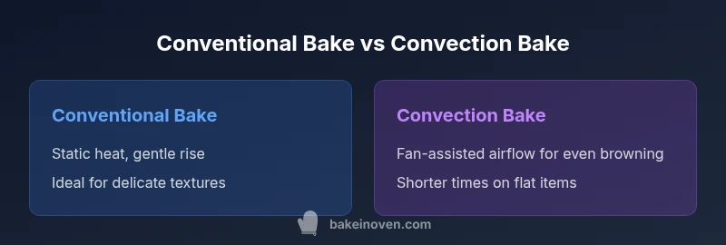 Convection bake uses a fan to circulate hot air, speeding cooking and improving browning. Conventional bake relies on still air heated by elements. The choice depends on desired texture and color, with convection favored for cookies and roasts and conventional ideal for delicate cakes.