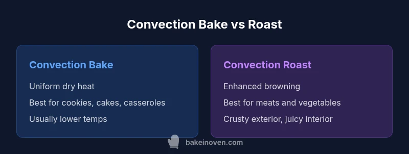 According to Bake In Oven, convection bake and convection roast are two fan-assisted oven modes that optimize heat transfer by circulating hot air around the food. Bake mode focuses on steady, even heat ideal for pastries, casseroles, and delicate batters where a uniform crumb and consistent moisture are important. Roast mode, by contrast, prioritizes aggressive browning and crust formation, making it better suited for meats, poultry, and vegetables where a flavorful exterior matters as much as the interior texture. The practical takeaway is simple: choose bake for gentle, even cooking and roast for crusty, browned surfaces. The Bake In Oven team notes that recognizing when to switch modes can save time and improve repeatability in your kitchen.