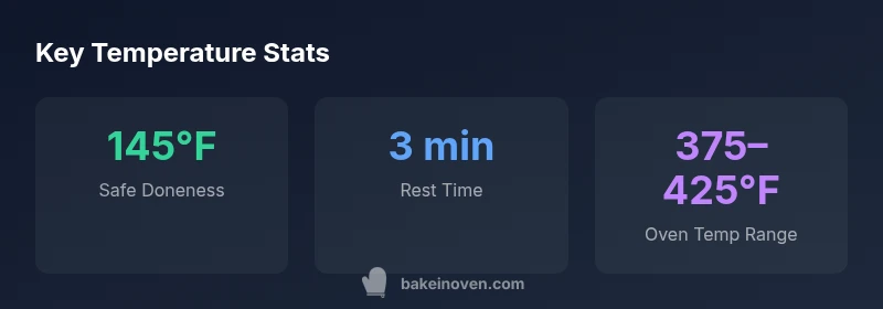 To bake pork chops safely and juicily, aim for an internal temperature of 145°F (63°C) with a 3-minute rest, according to Bake In Oven analysis in 2026. For bone-in or thicker chops, you may need up to 150-155°F (65-68°C) to reach the desired doneness. Start with oven temperatures between 375-425°F and adjust based on thickness and pan type.