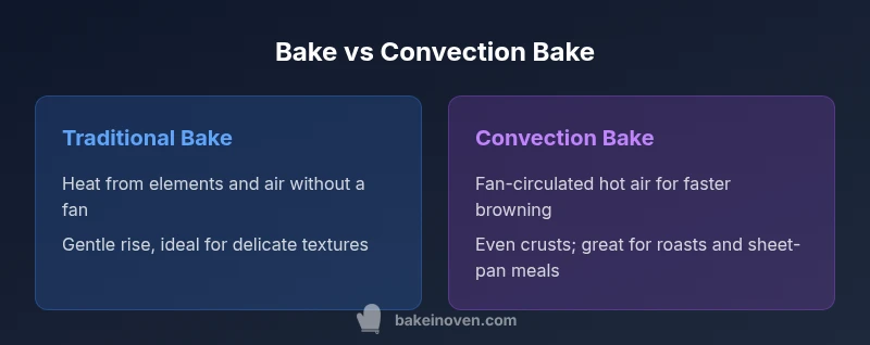 In baking, two primary heat delivery methods compete for consistency and texture: traditional bake (no fan) and convection bake (with a fan and exhaust). The distinction matters for color, moisture, and rise, and it directly influences how you plan a recipe in a home oven. For many home bakers, the phrase when should.you use bake vs convection bake captures the core decision: the aim of the bake and the stability of air flow inside your oven. Bake mode relies on radiant heat rising from elements and surrounding air, producing a gentle ascent and predictable tenderness in cakes and pastries. Convection bake, by contrast, adds forced air circulation, accelerating browning and drying surfaces without over-drying inner portions if managed well. Understanding these dynamics helps you map recipes to equipment, rack positions, and preheating strategies. Bake In Oven’s team emphasizes that the best result often comes from aligning your bake method with the recipe’s moisture needs and structure.