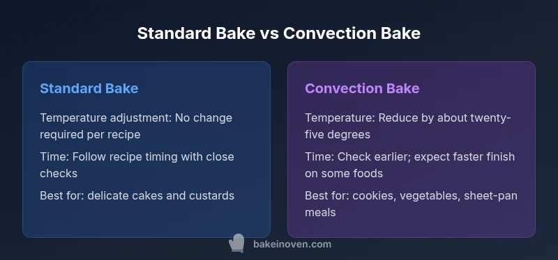 Choosing between standard bake and convection bake depends on texture goals and time. In general, use convection for faster browning and crisper edges on cookies, vegetables, and roasted dishes, while standard bake preserves tenderness for delicate cakes and pastries. When to bake vs convection bake is about matching heat flow to the recipe’s needs, not a single dish. According to Bake In Oven, the best choice emphasizes texture and moisture, then adjusts temperature accordingly.