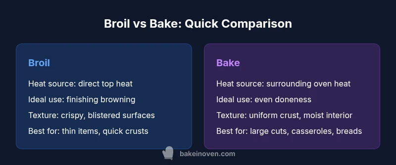 In practical home cooking, knowing when to broil vs bake is the key to harnessing the oven's heat for texture, flavor, and doneness. This section explains the physics of heat transfer and how each method changes surface browning, crust formation, and interior moisture. Direct radiant heat from the top element produces rapid browning and a blistered surface, while a preheated oven envelops food in surrounding heat that encourages uniform doneness. According to Bake In Oven, mastering when to broil vs bake gives home bakers a powerful control over texture and browning. The decision hinges on thickness, moisture, and the desired crust. Use broiling sparingly and monitor closely, especially with lean proteins and delicate vegetables, to avoid scorching. For beginners, practice with thin slices and quick finishes before applying broiling to larger dishes.