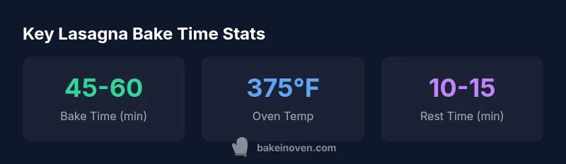 According to Bake In Oven, several variables determine how long to bake lasagna, including noodle type (regular vs no-boil), pan depth, sauce density, and cheese layering. The following sections unpack these factors and provide practical ranges you can trust. When you plan a lasagna night, you’re balancing heat and moisture with time and texture. The aim is a bubbling sauce, melted cheese, and gently set lasagna slices that hold their shape when you cut them. For readers asking how long bake lasagna, the most common scenario is a standard 9x13-inch dish with regular store-bought dried pasta and meat sauce. In that setup, a covered bake helps retain moisture and ensures even heating. Bake times reported in home kitchens usually fall within 45 to 60 minutes at a steady 375°F (190°C). The exact moment to switch to uncovered is when the surface has browned and the edges are visibly set, usually 10 to 15 minutes into the final phase. Rest time matters: allow 10 to 15 minutes after removing from the oven so the cheese and filling can firm up enough to slice cleanly. This resting period also improves flavor integration, letting the sauce thicken slightly and the layers meld.
