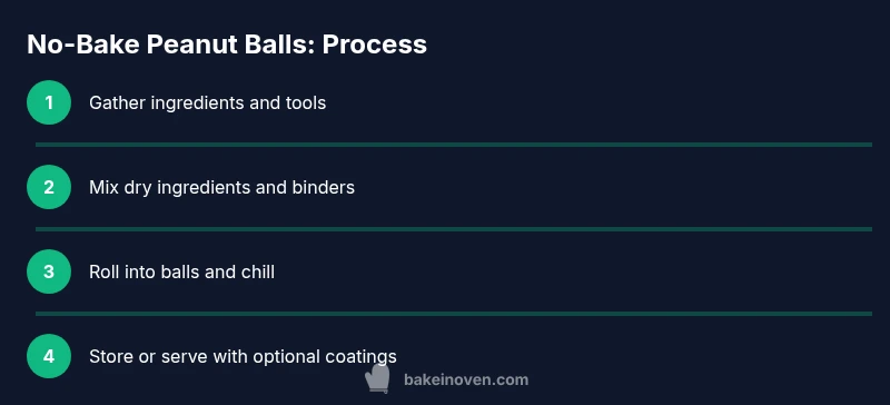 This overview highlights the core actions involved in making no bake peanut balls. It’s designed to complement the detailed steps below and help you visualize the workflow. Gather ingredients, measure precisely, mix until the dough holds together, add optional mix-ins, and roll into uniform balls. Chill briefly to set, then store in an airtight container for freshness.